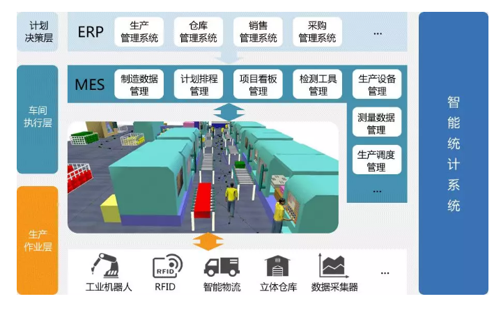 介于企业的“计划层”和制造“设备层”之间,对企业生产计划进行“再计划”,“指令”生产设备“协同”或“同步“动作,对产品生产过程进行及时的响应,使用当前确的数据对生产过程进行及时调整、更改或干预等处理。